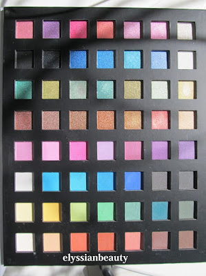v 56 eye shadows - 28 high pearl(top 4 rows) and 28 mattes&satins(bottom